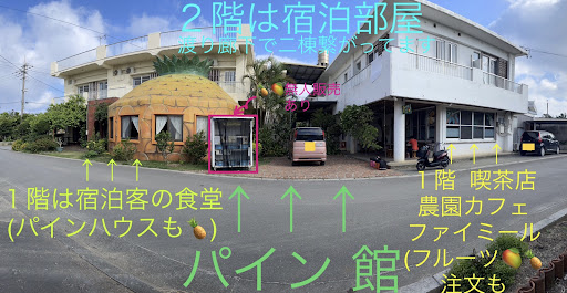 Read moreゴールデンウィークに二泊三日家族7人の大所帯で伺いました。|宿に着くと大きなパインの外観で、パイン館に来たことを実感ww|西表島の民宿では珍しい?お風呂付のお部屋を選びました。お部屋はとても清潔で、Wi-Fiの繋がりも良好です。|食事はどれも味付けが良くとってもおいしく、釣ったばかりの新鮮な魚のお刺身も食べれて大満足。ご飯は自分で盛るスタイルでお腹いっぱい食べちゃいました。|滞在を通してこちらの宿の一番の魅力だと思ったところは、従業員さんのあたたかさです。皆さん笑顔で対応が柔らかく、とても気持ちの良い接客で、お客さんもリピーターの方が多いというのが頷けます。従業員さんのお子さんもおり、とても素直でかわいい子達で、うちの子供もすぐに仲良くなり連日お庭で遊んでいました。|初めての西表島への旅行がパイン館さんで本当に良かったです。幸せな気持ちになれる、そんな民宿でした。|一つだけ困った点は、ここが良すぎて今後の沖縄方面への旅行はここ一択になってしまったところです。とくに子供たちは「もうパイン館以外行かない!」と言っていますww|幸せな時間を過ごさせていただき、...