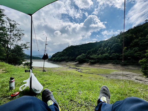 【7番サイトについて】 地面は土。半分くらい雑草です。 当日なかなかの強風で、タープのペグ(x補強の30cm)がぶっこ抜けました。 張る向きや形状が最悪だったのもありますが、あっさり地面がモッコリ起きてきてびっくりしました。 地面が緩いので、長めのペグがオススメです(次行く時は40cm持って行きます) タープを張るなら風の抜け道を考えて張らないと私のようになっちゃいます。 ですが、その分水はけは良いです。大雨でしたが、出来た水溜りが割とすぐに無くなっていました。 ダムに水さえあればメチャクチャ素敵なサイトだと思います。水ェ…