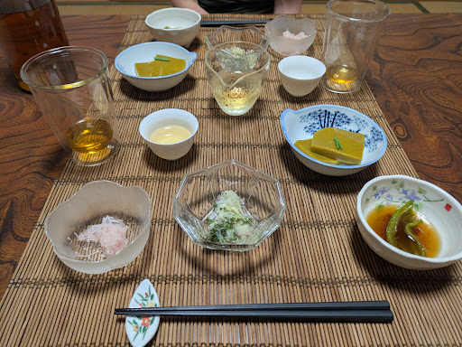 After settling in, our hosts offered to drive us to a local onsen of our choice. We visited a different onsen each night, allowing us to see and experience more than if we had stayed in just one. When we returned to the Inn, dinner was ready. The Inn offers dinners and breakfasts that include traditional dishes and local ingredients -- many from the hosts’ own garden! Crisp produce in beautifully dressed salads, hearty soups, freshly baked bread, traditional pickles, and a braised onion dish that we needed the recipe for. The tea dinner was particularly special, incorporating tea from their farm into everything, even tea tempura that tasted like gourmet popcorn! We had the incredible opportunity to listen to the host play the Shamisen (we also attempted to!)