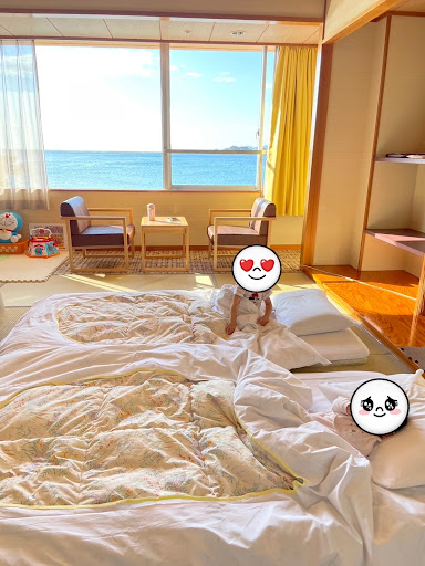お部屋の入り口にはパンダさんの絵があったので子供ももここ!と指差ししてわかっていたのでよかったです。ただ1番奥のお部屋だったのでものすごく長いなあ...チェックイン時思っていましたが、、、ロビーから遠い分、角部屋だったし赤ちゃんの泣き声が漏れてもいいように奥なのかなとも思ったり、朝早くからお風呂行く人が居たので、廊下をガサガサと音がすると子供が起きてしまうのが大変かなと思っての奥のお部屋だったのかな。とも思えました。運営側の配慮に感動です。チェックイン時荷物もあってお部屋まで運ぶの大変だったのでベビーカーを持っていって荷物を乗せて運ぶが良いとおもいます。