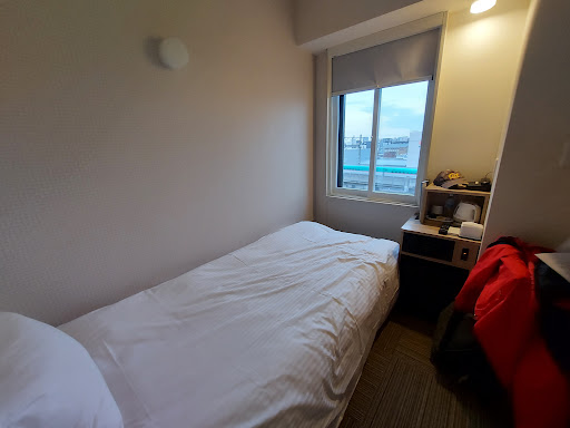 The location is absolutely amazing. It is right next to a station entrance and in a little neighborhood that is quiet. The view from the rooms are awesome and although the room itself was microscopic, it was livable. We did not get a room with the big train picture on the wall but that's fine by me. I preferred the plainness. What I didn't prefer was their inability to use the space they have. There is no where to store your luggage and if you are traveling with someone, be prepared to hop over them constantly if you're on the window side of the bed.