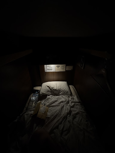All dorm rooms have a little shelf with a small safe box and a blackout privacy curtain. The mattress is quite comfortable and large enough for me at 176cm.