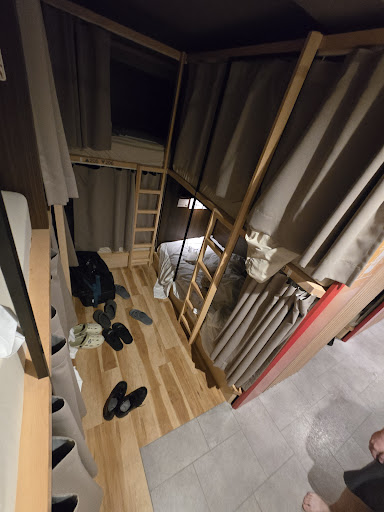 The top bunks we spent our single night in didn't have any guardrails to stop our belongings from falling. My friend, who is on the tall side, found the bed extremely uncomfortable and difficult to relax in because of the bed's small size, which also lacked a basic nightstand that seemed standard in other Japanese hostels.