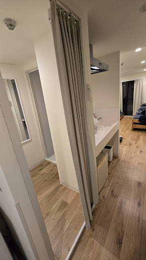 Le logement est assez spacieux, nous étions 2 et il y avait assez de place pour ouvrir nos valises et nos sacs. Il y a également un placard à l'entrée.