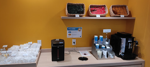 Free coffee machine at the lobby. Also a microwave available behind reception, so just give them your bento boxes and they will heat it up for you.