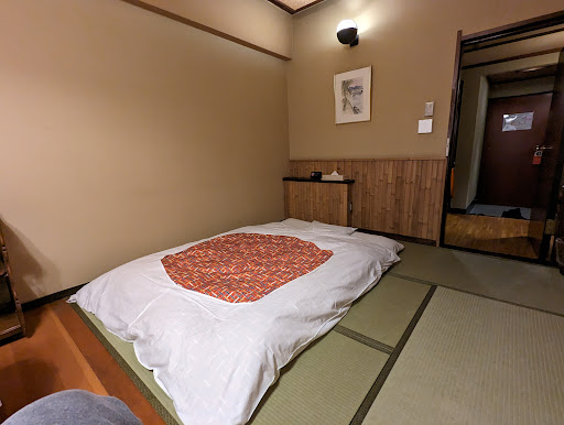 The room is okay size-wise, it has a kettle, a small TV, a little fridge, a little table with floor seats and two futons. There were some odd stains on the tatamis, walls and ceilings, so maintenance and cleaning in this area could be improved.