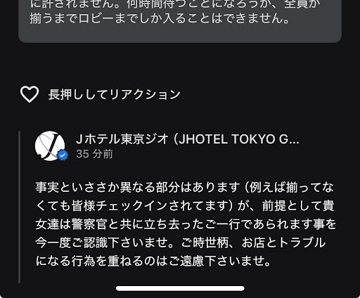 It was storming and so chilly that day so we came to see if there’s a room available so we could check in a bit earlier than check in time (around 4:30pm. Check in time is 5pm). We had asked them if we could check in earlier. They weren't very good with English so we asked again and tried explaining with hand gestures. That was when the manager came storming out saying that we were no longer welcomed into the hotel due to our rudeness to the check in staff and our disregard for hotel policy and told us to leave. We were shocked so we proceeded to try to reason with them. He continued to yell at us, threaten us, and would not be reasonable with us until we apologized. He then printed out the apology on paper (in Japanese) then forced us to sign it to have us recognize our fault. This was all while we had a language barrier.