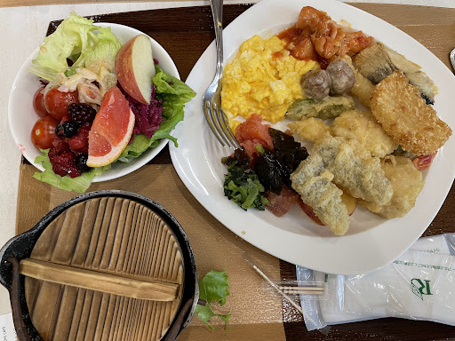The location and breakfast are my favorite parts of this hotel. Breakfast is the best I’ve had in any hotel. There are cherry tomatoes, sweet potato, seaweed, lotus root, orange slices, apple slices, grapefruit slices, pickled vegetables, shrimp tempura, chicken tempura, eggplant tempura, potato tempura, soft-boiled eggs, scrambled eggs, meatballs, mackerel, tuna, chicken in tomato sauce, hash browns, clam soup in a clay pot, clam rice, white rice, miso soup, pho, bagels, muffins, dessert, juice, milk, coffee, tea, and other items I’m surely forgetting.
