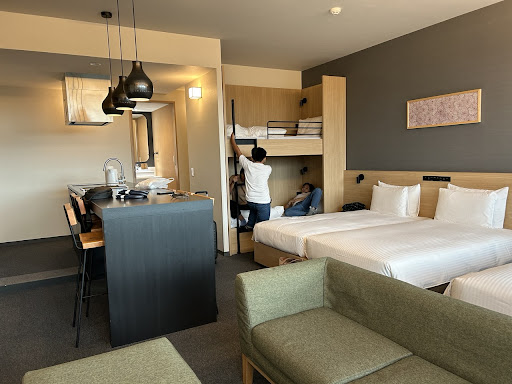 We booked a Family Apartment for 4 adults, which had a twin bunk and 2 twin beds together in the middle of the room. The size of the room exceeded my expectations compared to other hotels I have stayed at in Japan. Even with the plentiful bed space, there was a large table and sitting area where we could relax before showering and climbing into bed. Each of us had a carry-on, which we could keep open and not worry about tripping over. We also had 2 checked bags that we left closed for most of the trip.