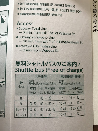 Read moreRihga Royal is a 4 star Hotel located near Waseda and Takadanobaba stations in Tokyo.Relatively small hotel with 12 storeys and roughly 20 rooms per floor But this meant that the double room was amazingly spacious at sitting at 33sqm. It was a treat. It had a old imperial Japan kind of feel and although amenities and furnishing were on the older side it gave the hotel a distinct feel which was unique. Closest station was Waseda at 800m away but they had a free shuttle service roughly every 20mins to Takadanobaba station taking about 10mins and also had 2 lines connected to it which was pretty convenient. Front desk was not a desk but rather 3 separate tables which definitely felt worthy of 4 stars and the staff had very good english so no Japanese was required. The shuttlebus was so convenient and ran late into the night with the last bus leaving Takadanobaba at 1040pm which gave ample time to explore Tokyo. Room was very comfortable and although the bathroom didnt come with separate shower and tub space it was large enough not to notice. The breakfast spread was a mix of Japanese and Western cuisine and they had this amazing french toast that had a piece of parmesan cheese on it and then blow torched to perfection it was pretty damn amazing. Running at ¥2000 per person it was cheaper than booking breakfast together with the room. Overall although it was more expensive than a 4 star hotel room in other prefectures SGD $200 was a reasonable amount given that I booked it for the weekend and it...