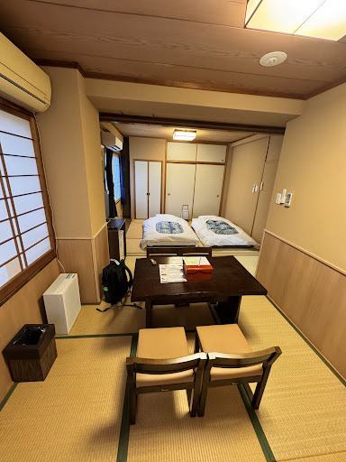 Read moreOf all the places we stayed at during our trip to Japan, this may have been our least favourite, simply because we felt the value for money was a bit off.||||First the positives:||- The staff is absolutely lovely. I cannot stress this enough. The gentlemen at the front desk were among the friendliest people we met during our trip, and extremely helpful.||- The location is fantastic, centrally located in Asakusa, and only about 2 minutes walk from the nearest metro (Asakusa, Ginza line).||- The living space was definitely larger than what we were used to from other Tokyo hotels. It consisted of a small entry area, a living room, bedroom, and tiny bathroom, and was also well-equipped. Fresh tea & small snacks were provided daily.||- The hotel offers a private onsen that can be reserved for 30 minutes each day, which is especially nice if you want to experience that type of hot bath together with your partner.||- Our room was nice and quiet, no noise from the street or other guests, and the futons were comfortable.||||And the negatives:||- When I say the bathroom was tiny, I mean that it was basically a plastic cubicle that offered so little space that the sink was directly under the shower, and your knees were almost the touching the door when using the toilet. The bathrooms we had on our trip were generally not big, but this one took it to the extreme.||- The room itself was nicely proportioned, but the bedroom area was still rather cramped, and just barely fit our 2 futons and suitcases. ||- All in all the room was very bland, rather dark, and it seemed... old. Not worn, more like 80's-style old. All the walls were bare except for one not very pretty picture which hung right above the television, making that one wall seem overly crowded and the others even more bare. Having stayed in a few japanese-style hotels during this and other trips to Japan, this one felt dreary in comparison... it just lacked that certain charm we had experienced at most other traditional-style places. ||Added to that were small nuisances, for instance there was a hole in one of the window papers which hadn't even been tried to get provisorily fixed before we moved into the room.||||We didn't try the breakfast, so we cannot comment on that.||||While the negatives may seem minor compared to the overwhelming positives, we just felt that, for the price we payed, the negatives just stood out so much more... and while we don't regret having stayed here, we will probably not be booking here again on our next...