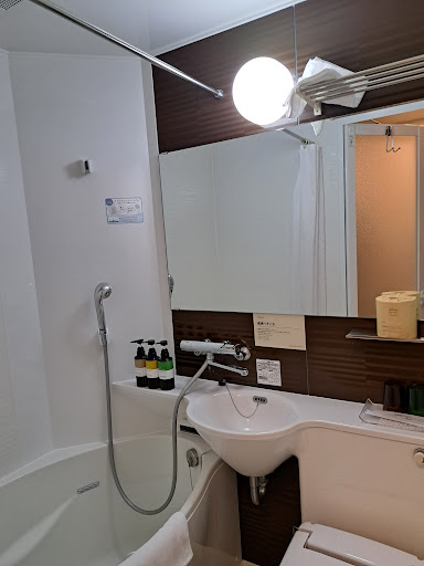 The room was small, as is the usual with Tokyo hotels, but it packed a lot of things in efficiently - a big soft bed, a small desk with chair, a small shelf area with a mini-fridge, a clothes rack, and a great AC unit. The main pillow was oddly quite hard but I still slept soundly every night aided by the great soundproofing and the general quietness of the hotel. I got a theater room with a nice projector TV but got little use out of it since I opted to be out and about as much as possible except to rest up at night. The bathroom was tiny - again fairly par for the course in Tokyo - but made very efficient use of the space.