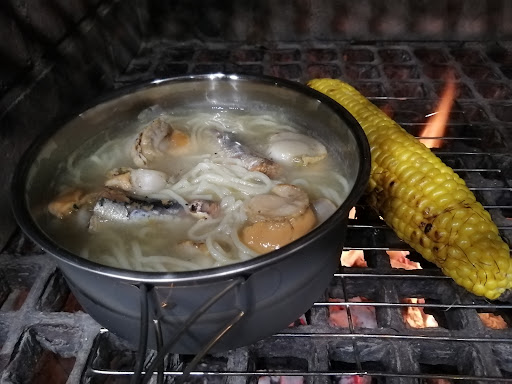 デッキに設置されている常設のデッキテントの利用者であれば、テーブルと椅子、個別の炊事場(洗い場、炉)もあり、包丁、まな板、鍋や飯盒などの調理器具や食器も無料で借りられるため、食材のみ持ち込めば自炊が可能です。(薪と炭はサービスセンターで売っていますが、カセットコンロなどはありませんので、炉を使えるスキルは必要です)