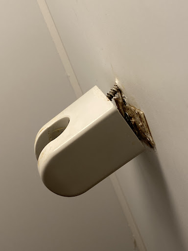 • The shower head was hanging off its hook. A nail fell out while I was showering, and I had to fix it myself.
