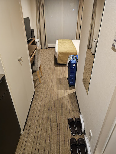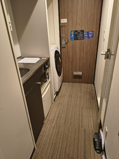 This is a basic business hotel in a quieter ward, Setagaya of Tokyo. It is a short 15 min train ride from Shibuya. We stayed in a superior twin room which had a bit more room than the superior/moderate doubles we stayed in Japan (Kyoto, Hiroshima, Tokyo) which were 17 square meters. The bathroom is one room and a bit dated. Lighting is very low. However, there are some other ammenities, such as a kitchen sink, stop top, microwave and washer/dryer. It is nice to have the washer dryer in the room rather than shared in common areas. The bed was comfortable and fresh linens were provided. There is no breakfast service, just very bland coffee/tea in the lobby. The ammenities bar is a bit lacking relative to the other hotels we stayed in Tokyo. Just toothbrush, razor, cotton pad, sponge. There were no face wash type samples.|| A few other perks to this hotel is the fact that it is less than 50 m from the escalator to Yoga station. Attached to the station is a business/shopping area. There are decent restaurants and grocery stores (Fuji Mart and OK) nearby. We went to these to get breakfast food and stored in the fridge. If you want more sophisticated shopping, Futako Tamagawa shopping center is a 23 min walk down road 246 (from the hotel). There is also an awesome coffee shop, called Woodbury, a few min south of the hotel. They make serious coffee.||It was relatively inexpensive if you booked well in advance (74 00 yen...