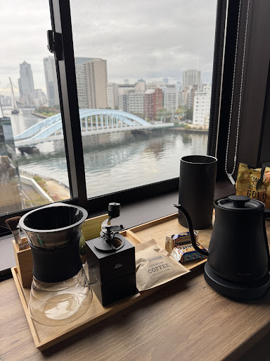 The hotel welcomed us with a bottle of sparkling wine and fresh coffee beans, which we could use for the drip coffee setup in the room—such a nice touch! Plus, our room had a beautiful view of the river, which we loved.