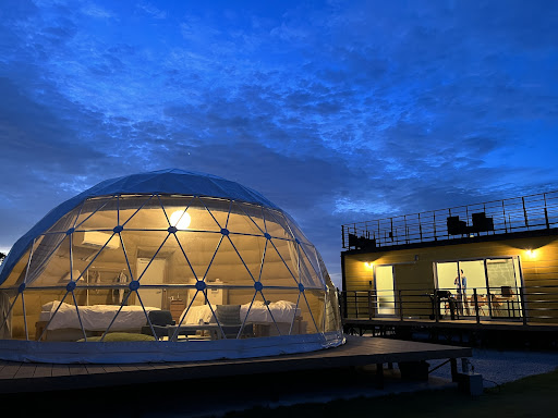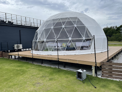 ドームテントは中もオシャレでホテル並✨️ クーラーやWiFiも完備で過ごしやすい。 ドーム内にはソファもあって、そこから山頂の景色が一望できて最高✨️