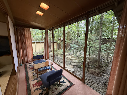 Room We booked an 8-tatami room with a wooden bathtub with onsen water. 1 tatami is the size of a single bed (3x6ft). This is alright for my group of 3. The room has 4 bedding sets, and that would feel slightly cramped. There is also a larger room with an onsen bath and a few smaller rooms without an onsen bath. Rooms with onsen bath are in "bessou", meaning annexe. It features a beautiful garden with flowing water. My group is lucky with a room on the ground floor to walk around the garden and listen to the water flow.