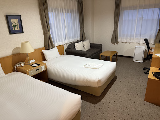 This is one of the most northerly hotels in Japan. It is an old building but it has been renovated and is quite comfortable. Our room had a small lounge area with sea views through each window. There had been 200mm of snow so it was difficult getting around, but a taxi from the station was only the flag fall charge (610JPY) and was well worth it. We could have easily walked if there had been no snow. There was no English spoken at all and I think we were a bit of a novelty for the staff. There is no laundromat or coffee in the lobby, but there were custom made (for the hotel) yukata which fitted us large foreigners. There is a free hot spa on the...