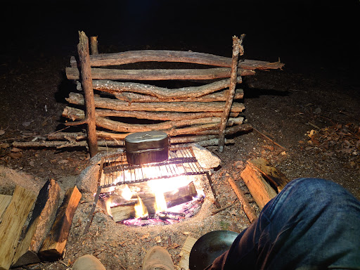 5歳の娘との山行に備え、山中での野営の練習のため、サバイバルエリアに泊まらせて頂きました。 山中の沢そのものの環境で、落ちた枝で焚き火し、沢の水を使って料理し、ビバークできました。