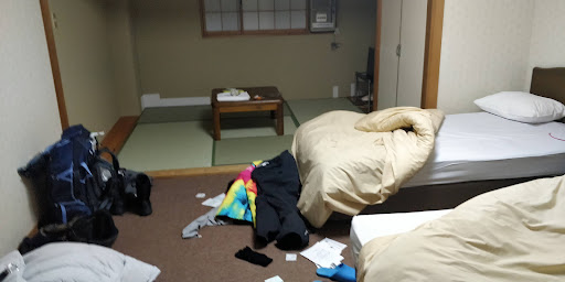 Where to start.. The room itself is spacious at least, split into a lowered carpet section a raised tatami seating area. The beds weren't too uncomfortable, but had only a single doona covering and a bedsheet the bathroom was extremely cramped and hadn't been cleaned properly, only a wipe over the top to shine it, the undersides of the sink and toilet were covered In black slime.