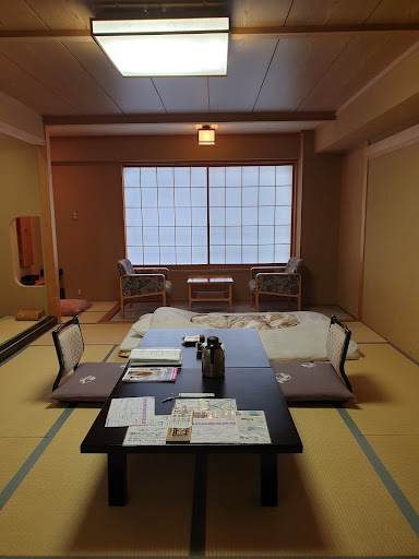If you plan to ski in Shiga Kogen and you’re wondering where to stay, you have to answer a first basic question: do you stay in a contemporary hotel up on the slopes, or down in the valley in a traditional Japanese ryokan with an onsen fed by natural hot springs? ||This review is a recommendation to go for the ryokan experience, and specifically for the Shibu Hotel in the village of Yudanaka. To understand the Shibu’s charms I’m prefacing my comments with what I think is important context and useful info.||Shiga Kogen is a vast ski area of 18 interlinked resorts. The resorts are located on the slopes of the mountains at about 1400 meters (4600 ft). Many appear to have been built in the 1990s for the Nagano olympics. Many of them are ski in/out. We did not visit any of them, but as best we could tell there are few if any restaurants, bars or convenience stores that aren’t located inside a hotel. These are resorts.||The resort experience is probably great. There are so many lifts and gondolas that we literally did not have to wait in line once. There are so many trails that we never felt crowded. There were even times we had an entire piste to ourselves from the summit at 2000 meters to the gondola station below. In five days skiing we managed to explore a fraction of the Shiga area. It’s fabulous. If all you want to do is shred, ski out at 8:30 and ski back in at 4:30, this is the place to do it. You can ski till you drop.||But if you also want a bit of the Japanese cultural experience, you should stay in Yudanaka, an ancient little village built around the Shibu Onsen hot baths whose history goes back more than a thousand years to when it was the place for a bath and a rest for pilgrims on their way to the Zenkoji Temple.||Yudanaka is the last stop on the Nagano Dentetsu electric rail line. The main village lane is a charming narrow street cobbled with small pavers and lined by traditional wooden ryokan and small stores (one converted to a free public table tennis hall), interspersed by skinny alleys that lead up the hillside to who knows where. There are also little restaurants -typically seating no more than a dozen people- next to shrines, old carved-stone, spring-fed foot baths and, of course, the onsen. ||There are nine onsen in Yudanaka. Each taps a different hot spring in the mountains above - each is said to deliver water with slightly different mineral properties, to treat different types of ailments. Some people buy a commemorative junyoku on which to collect a stamp from each onsen. ||All guests staying in the member-ryokans are welcome to use the onsen for free (non guests pay a small fee). So foreigners and Japanese both walk the village lane, wearing their yukata and geta, more about which later.||These nine public onsen are maintained by a group of village ryokan owners. We stayed in one of these inns called the Shibu Hotel. It was one of the most charming travel experiences of our lives.||Management of a ryokan is typically a family affair. Ownership in some families extends back more than 15 generations. The Shibu hotel has been in the Yamada family for three generations and they take enormous pride in making their guests feel like family. ||Different hotels in different places call for different approaches to their guests. I wouldn’t expect to be treated as family in, say, a fashionable Manhattan boutique hotel, but in a ryokan the tone is set the moment you enter the front door: you sit down on a stool to remove your shoes and pull on slippers from the inn’s collection, slippers that have been worn by many guests before. This simple act creates a different sensibility, from the moment that you arrive.||Nevertheless I cannot stress enough the impact of Kazuyoshi Yamada and his wife and family on the experience. They are all immensely proud of their business that has been in the family for nearly 100 years. They clearly take great pleasure in making their guests happy and go out of their way to make it so. Whether offering to drive you to and from Snow Monkey Park first thing in the morning, or finding painkillers and bandages for a sprained wrist late at night, they are always happily attentive, always wreathed in smiles, always helping you feel welcome, perhaps with an impromptu lesson on how to wear the yukata or an invitation to try the free refreshments in the lobby. ||Our room was lovely, especially in the late afternoon when sunlight flooded down from the mountains through the shoji screens, creating a golden glow. We had a room on the fifth floor, on the side facing the river. The view extended from the foothills of the Shiga Kogen mountains to the south east all the way to snow-covered Mount Takatsuma 10 miles away to the north west. Directly in front, across the street from the hotel, was the Yomase river, topped on the far bank by the road that leads to the mountains.||The room was always pleasantly warm, without much help from the split-level a/c in the room. But under the thick duvet we felt a little hot, so we would crack the window open at night, which meant we could fall asleep to the sound of the river tumbling by.||The room was decorated in the traditional ryokan style, with light colored and sound absorbing wood paneling. The room was quiet and large with two western queen beds. It had an entrance area by the door where you could remove your slippers, then a bathroom split into three: a toilet in it’s own private space with a door, with the obligatory washlet of course (Japan is a Toto dictatorship); followed by a washbasin, and then the bathroom with a tub and a hand-held shower area for washing Japanese style.||The room had traditional, thick, gold colored tatami mats throughout, which created a luxurious feeling underfoot. It had a bar with a Keurig-style coffee maker and a fridge with small cans and bottles of free beer, wine, soda and juice. Each day the cleaners would leave samples of mochi or some other local delicacy. They also 