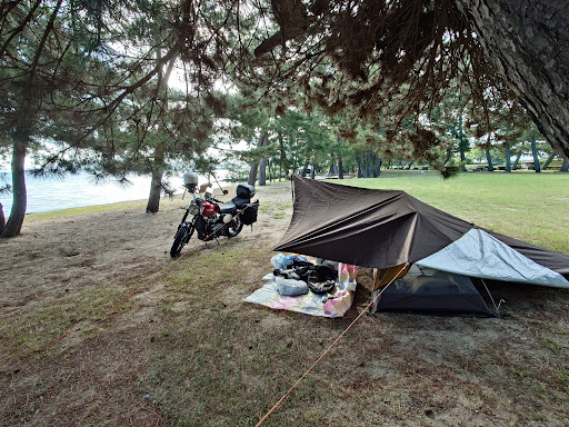 I used it on a weekday. It's a cheap free site, but it was empty so I was able to pitch my tent wherever I wanted. It's like a sandy beach by the sea, so I completely forgot it was fresh water. There's no need to worry about the sea breeze rusting your motorcycle and there are no big waves washing up in the tent. It's not the sea 😁 When the sun goes down, a pretty cool breeze blows even in July. The facilities are also good. There are lots of pine cones on the ground, so if you're riding a motorcycle, be careful not to fall when you ride through the square at night 😆 You can see how nice the place is by looking...