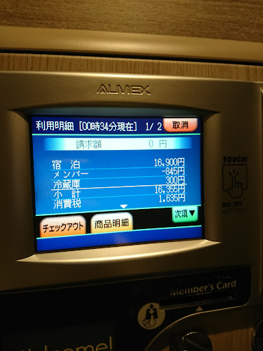 ホテル入り口のタッチパネルの表示金額(¥8,900)と部屋に入ってある自動精算機の表示金額(¥11,900)が違う詐称ホテル 詐欺にあった気分です。 フロントに連絡するも、タッチパネルの下の部分に書いてありました、と。皆さんそれで納得してもらってます。 え、まじ?だったら、金額変えておけよと言うと、機械のシステムの都合で変えられないと。話にならない。金曜日は¥1,000アップ、土祝前日は¥2,000アップとのこと。なにそれ?
