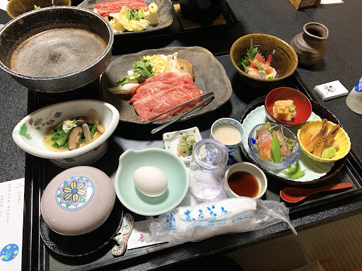 夕食 通常すき焼きですが、しゃぶしゃぶを選択しました。 食前酒の甘酒、伝統料理の冷汁と見事なサシの入った米沢牛のしゃぶしゃぶとしっかり地の食材を使っており、また胡麻ダレに甘酒っぽいもの入っている様に見受けられ(朝食で出た郷土の調味料358サゴハチの様な気がします)、茶碗蒸しにもホタルイカ入っており春らしさを感じ全体的に良かったです。 そうそうデザートの豆乳プリン、地元の豆腐屋さんの物の様ですが帰りに買って帰りたくなるくらい美味しかったなあ。