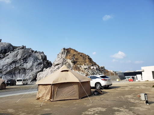 Read more誰が言ったか「日本のエーゲ海」 青い海と白い巨大な石灰岩に囲まれたこの地でキャンプできる。ただそれだけでここに訪れる価値はあるってもんです。 ワクテカしながら出発しようとするとスマホがなり「現在風速14mと言う強風の為キャンセルするのであれば無料承りますよ」 そう、伊豆の夕日丘キャンプ場でもそうですが海辺のキャンプ場は強風が吹きやすいのです。 さて唐突にここでサイト紹介。 このキャンプ場、道の駅で受付を済ませて進むとすぐに東側区画オートサイト、次にコテージ練、奥に行くと西側区画オートサイト、その反対側が車を止められないフリーサイトとなっております。 自分がなっぷで予約していたのはフリーサイトでしたが現地に行って吟味の上、東側区画オートサイト1番に変更してもらいました。 何故か?フリーサイトは価格がオートサイトの半分の代わりに電源が使えない、地面が砂利等の差別化がされているのですが車が侵入出来ないのが一番辛かった。強風時は車を風向きの方に置く事である程度軽減されるってふもとっぱらで学びましたからねwしかもこの東側区画オートサイト1番、隣がでっかい炊事棟になってるんですよ。まさに風が強い日にはうってつけの場所でした。2日目の夜更に風が強まってまるで嵐の様相の中バッチリ耐えてくれましたからね。一応予備テントも持って行ったんですが杞憂に終わりました。 後ここ、巨大な石灰岩群に目を奪われがちですが星空もすごい!是非夜に星空観察して見ることをおすすめしますね。まるで自分が異世界に迷い込んだ様な気分になる事請け合いですよw