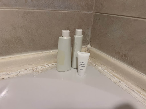 Overall the hotel is in great disrepair. Everything looks old and shabby. The bathroom shower was a disaster with a crappy plastic shower curtain that fell with the weight of a wet towel over it, and the caulking was amateurish to say the least (see photo).