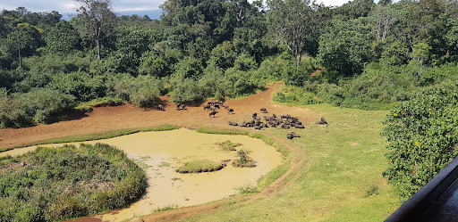 Read moreSiamo stati una notte qui, e ci è sembrato di stare un po' in uno zoo. Non è possibile fare safari in auto, ma solo a piedi con l'hotel (pagando 30 Euro a testa): noi non l'abbiamo fatto a causa del tempo instabile, ma passare un pomeriggio affacciati al balcone davanti ad una pozza non è stato il massimo! Abbiamo visto elefanti, bufali, gazzelle, facoceri, cioè nulla che non si possa vedere in luoghi molto più naturali (e in modo più spontaneo). ||Soprattutto, è riprovevole che l'hotel metta sale nell'acqua della pozza per attirare gli erbivori (che a loro volta attirano i carnivori), e ancora di più che metta esche di carne su un piedistallo innalzato davanti alle camere, per attrarre leopardi o genette, i quali poi si trovano costretti a restare lì a mangiare perchè il ciibo è legato!! In questo modo gli ospiti possono guardare gli animali (di notte c'è la luce elettrica a illuminare la pozza), ma è una pratica crudele (soprattutto perchè ci sono tanti cretini che fanno foto con il flash, nonostante sia probito), un parco giochi triste se si pensa a tutto ciò che si può fare e vedere in Kenya. ||Passiamo all'hotel in sè: vecchiotto, poco pulito, triste (ci hanno detto che lo standard dei Serena di solito è tutt'altro), anche se l'arredamente insolitamente rustico ci è piaciuto. Purtroppo la nostra camera si trovava a pochi passi dai bagni comuni al piano, che emanavano un terribile e fortissimo odore di urina, come (ahimè) il nostro bagno in camera, il quale per di più aveva una porta che non si poteva chiudere dall'esterno! Veramente indecente, per un posto del genere. Carino invece il pensiero della borsa dell'acqua calda per la notte...davvero da altri tempi!||Gli spazi comuni sono carini, ma la sala ristorante è piccolissima e c'è una grande confusione. Il cibo è ottimo (la sera si sceglie un menu, per il resto c'è un buffet infinito), il personale gentile anche se a volte un po' lento e confuso. Non si può fumare da nessuna parte, nemmeno sulla propria veranda, ma solo sul tetto all'ultimo piano (perchè?). ||La sola cosa rimarchevole in positivo è che, se si vuole, si può essere svegliati di notte in caso di avvistamento di animali (si può scegliere quali vi interessano): noi all'1.00 abbiamo visto un branco di 9 iene che urlavano e giravano attorno alla pozza, e devo ammettere che si è trattato di uno spettacolo unico ed emozionante, visto che non è ovviamente possibile a nessuno fare safari notturni. Ci siamo fatti svegliare anche per vedere l'alba sul Monte Kenya, anch'essa molto bella...