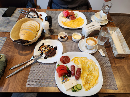For our road trip from Budva to Skopje, we wanted to rest in Prizren for a single night to break the trip. We stayed in "Budget Twin Room". The room had 1 window facing a beautifully painted, small but relatively luminous interior courtyard. It was enough to bring light in. All the furniture was new, clean and modern. The beds and bedding was super comfortable. The room was small, but enough for a single night. Closed parking garage is definitely a plus. Though, entering and navigating would require at least intermediate driving skills. Breakfast is fixed plate prepared freshly. Standard single plate portion with bonus of pancakes😋 As for the staff, I want to especially mention and recognize Blendon. He was very easy to communicate with, very helpful, kind and good-humored.