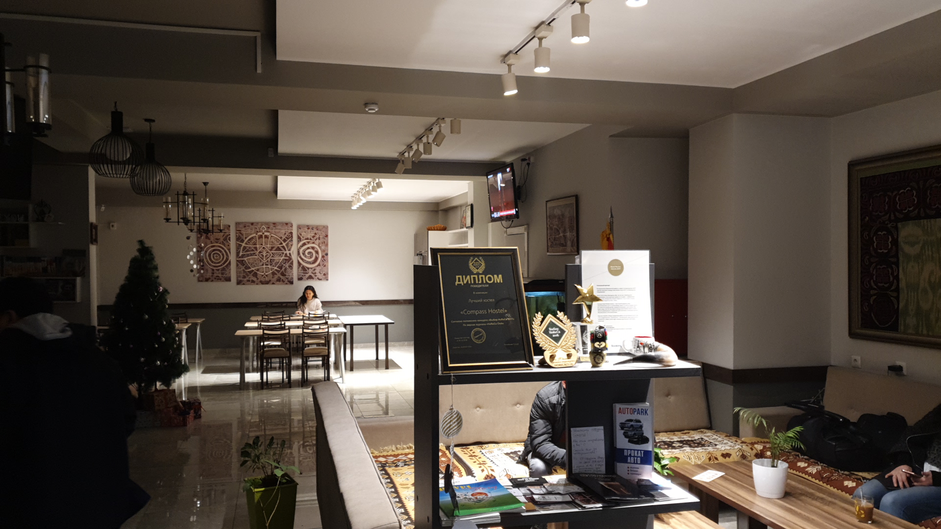 Read more"COMPASS HOSTEL" is situated on ground floor of a plush building on Tynystanov Street, All the prominent tourist landmarks of Bishkek City Centre are within walking distance from this locality. Very clean and well maintained hostel with the Globus shopping mall just across the street for purchase of groceries, etc. Manager Ms Altynai speaks English and was very helpful in showing me the important landmark parks on the tourist map as well as helping me get a booking for a group tour to "Issyk-Kul Lake". Free breakfast of continental type is available in...
