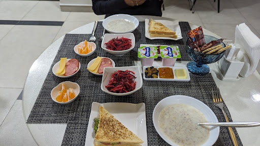 We booked the Golden Hotel in Bishkek through Booking.com. From the outside, the hotel looks big, but inside it’s actually just one floor — still, it’s beautifully designed and clean. We booked two rooms for our family of five — they gave us one room with three single beds and another with two single beds because they didn’t have any double-bed rooms available at that time. The rooms are small but neat and tidy.