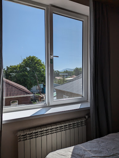 During the motorcycle trip to Kyrgyzstan with my husband and two other friends, we slept 4 nights in August in Karakol and Hillside was the perfect place to stay. Cozy, well-kept, impeccably managed, clean and organized hotel. A strategic stopping point. In a green corner, in the residential area of the city, the hotel is a happy and very comfortable island. Easily accessible and with nearby convenience stores. Delicious and varied breakfast. The center can be reached on foot with a pleasant walk or alternatively with a few minutes by taxi. The owner, who runs it together with his wife, speaks excellent English. He is a special person. Courteous, helpful and present. Help guests with all their needs. In short, I absolutely recommend the hillside. A beautiful place to rest and sip your coffee on the veranda among the flowers and the magic of the mountains of Kyrgyzstan....