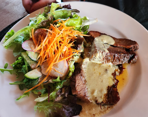 My wife and I decided to drive out of the city for a nice quiet meal. I had this restaurant marked on my map for some time, so I decided to visit. Finding it might be a bit tricky if this is your first time in the area - it is not right beside the highway. After a literal minute drive off the highway, you will be in the spacious parking lot. It is located on a very nice piece of real estate. They have lots of outdoor seating and a play area for the kids. There is a small pond nearby as well. When we entered, we were greeted by their friendly staff, and after a little walk around their seating areas, decided to sit indoors by the door. Their menu choices offer a nice selection, and of course, great meat cuts hard to find even in Riga. We started with a few drinks and their foccacia bread - very nice. My wife had the Brisket while I had the Picanha cut. These were both delicious and cooked perfectly 👌. This was the first time I had this cut and loved it. I will say that it may not be for everyone with a thick outer fat strip. It was seared nicely to give it a great taste. Just a small note, try to grab the seats with the cushions. The rustic flat board seats may be a bit uncomfortable to some. Our waitress was very nice and did her best to answer our questions. Thank you very much for a great meal, and maybe we'll look at an overnight...