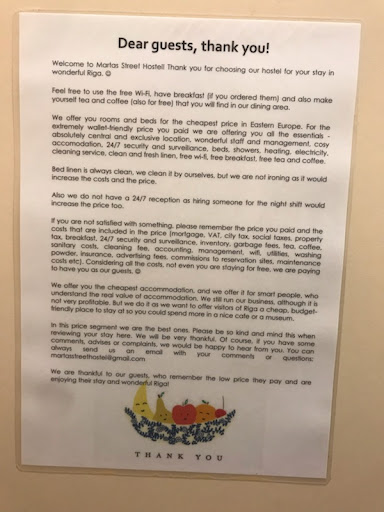 Read morethe WORST hostel i've ever visited!! Especially for girls NOT recommended. Frightening and disgusting people there and it seemed they live there. No reception and you cant see who is member of the staff and who is a guest. 12 people in one room together with too little space for everyone. In the whole "hostel" is too little space and on some points you have problems to walk trough with a backpack or luggage. The "breakfast" is a little bit cold cutmeat and cheese, but its so long on the plate that the meat is brown. The only clean thing where fortunately the beds and the bed sheets, which are free. The showers and the toilettes are dirty, maybe broken and the smell was very bad because you couldnt find any window. The smell in the hostel is everywhere disgusting, because of missing windows and shoes everywhere. The young staff lady was willing to help, also with tips for Riga, but other staff members weren't able to speak english and so it was difficult to ask something. The "kitchen" is too small to call it a kitchen and better dont plan to use this thing. Everything is dirty and even after 30 Minutes cleaning not possible to use. The only positive things is really the location...