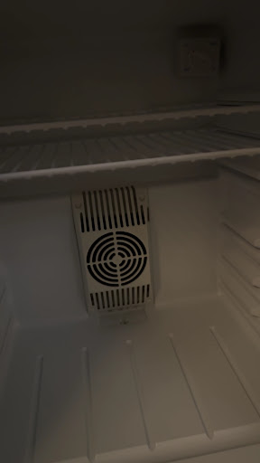 Mini-fridge was turned off when I moved in. Unless I've noticed it, I'd spoil my food over the first night. However, if I turn it on, the light stays permanently on. So, you have a choice of sleeping in darkness or storing some food in a fridge, but not both at the same time.