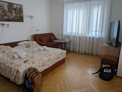 We stayed in this hotel in January for 4 nights. It is extremely easy to reach as it is located just up the hill nearby the Old Town. I've read reviews complaining about the steep hill, but that's exactly the excercise you need after having a huge meal in one of the nearby restaurants.||The hotel has private parking place and several ensuite apartments. We stayed in the studio on the first floor. It was spacious, bright, clean and had everything we needed - toiletries, towels, hairdryer, mini fridge. The kitchen was fully equipped to make your own meals, but we preferred to eat out. There's even a washing machine in the bathroom, which families with small kids or longer staying guests could benefit from. Also need to mention free wifi!||Even though the hotel is located right in the city centre, the rooms are surprisingly quiet. Our studio had a view of the back garden which was lovely and snowy this time of year. It was pretty spacious and would be great to chill on a relaxing summer night. The view from the back garden is amazing - you can see pretty a large chunk of the busy old town.||The owner lady was very nice and helpful, and gave great recommendations for local restaurants and shops.||Will definately be staying here again when we're in Lithuania...