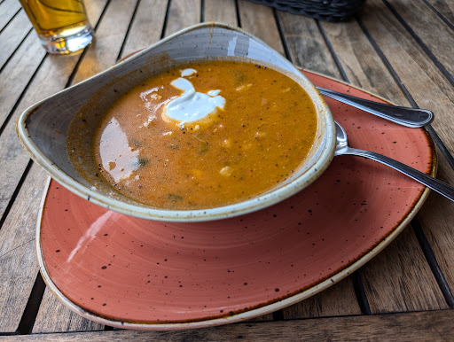 Nice place and the food is OK. Unfortunately the service is tragically slow. We ordered at the same time 2 alcohol free beers, 2 soups and 2 main courses. The beers arrived after 30 minutes. The beers were warm. The soups followed 20 minutes later (50 mins from the order). The soups were actually the best course of our meal. The main courses 30 minutes later (1h 20 mins from the order). They were cold and very greasy. There are few waiters working for the amount of customers and I'm sorry for them as they are visibly very tired. I'm not sure how many people in the kitchen but probably also there not enough for handling the orders timely. At least the waiters could have inform about the long waiting times so we would have made an educated decision. Overall: customers are unhappy, people working there are overworked and this is caused by a tragically bad management of the place and poor communication. Also we were on a long distance trip, we stopped to charge our car in the fast charging station right outside. It took almost 4 times the full charging time and we were...