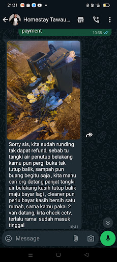 Trip family ke Tawau, Semporna on 31hb till 2hb..stay di homestay ni 3hari 2mlm...fobia dan trauma tinggal di homestay ni...sudah Sy buat full payment di booking.com...then owner minta extra deposit 200 di luar...sebenarnya ini slh sudah tapi Sy follow saja rentaknya.sbb 1st kena bgni...ini MMG style mahu scamm orang..bila cek out depo Sy x di kembalikan..alasan rumah xbersi..aikk..bukan ada cleaner khas kak mana2 hotel dan Homestay..alasan sudah cukup murah kunun..dituduh lagi kami panjat dan buka tutup pintu tangki blkg rumah..Ainaa...masih waras lagi buat apa panjat2 itu kerja 🐒.. 😂😂..lepas tu siap gambar sebotol mineral dlm tong sampah' tu..rumah terlampau bersih sbb siap kami sapu tu rumah sebelum cek out..kerja cleaner KMI ambil alih skjp.haha..hati2 yg mahu menyewa homestay ni silap haribulan kena scam kamu kena minta extra depo mcm Sy...mudah2an jadi pengajaran di mata dunia tindakan susulan Sy nanti..kamu tgk saja alasan yg...