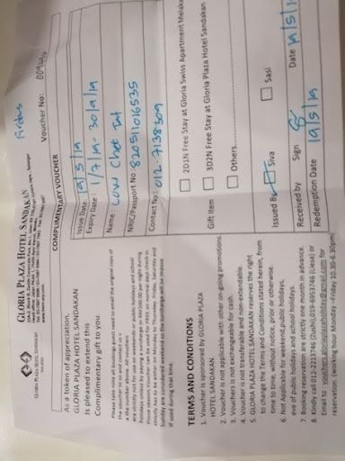 Read moreYou wonder where you are heading when you take the access road to the hotel. It is one of Sandakan’s terraced rows of shops with accommodation above. The receptionist was welcoming and pleasant. |We had two interconnecting rooms, slightly different layouts, but very spacious. Bathrooms were well equipped with spacious showers and plenty of water pressure. Hand towels and bath towels supplied along with flip flops. Bedrooms are semi divided in some way so you may have a sitting area too. Ours had a partition towards the foot of the bed and it had a TV in it which swivelled so you could watch it in bed - showed thought. Plenty of space for storage and luggage. There was also a fridge. Bed was king sized and comfortable.|There is no restaurant and no lift, so pack wisely. We were heading to Sepilok in the morning, so had a late breakfast there. There is a big supermarket two minutes walk away and the town centre is about 12 mins drive. Whilst I wouldn’t wish to spend the week in the Gloria, it is clean and functional and has everything you need and was very clean for one or two nights. We...