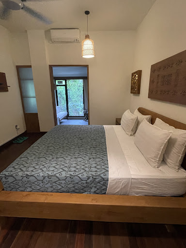 There are two types of accommodation here. Deluxe rooms which are all set together around a garden courtyard area near the reception building and the small swimming pool. Villa rooms which come in pairs in "chalet style" cabins further along the boardwalk/ amongst the forest. We stayed in a Villa room because we were a family of 3 and I think the rooms are slightly bigger for that purpose. It had a huge queen sized bed which was very comfortable + Z'bed for child; free bottled water; fridge; kettle with tea and coffee; veranda; plenty of storage and hanging space; massive bathroom; toiletries; air con; ceiling fan; mirrors: desk; hairdryer; multi national plug sockets with USB ports; digital safe; flip flops and umbrellas to borrow.