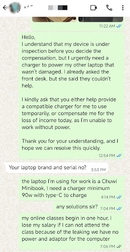 His idea of customer service? Ignoring messages—apparently, because, later when we are at the police station he told me, my texts had nothing but "lists of items and figures." Excuse me, what else should I send when my property is soaked in your room? A love poem?