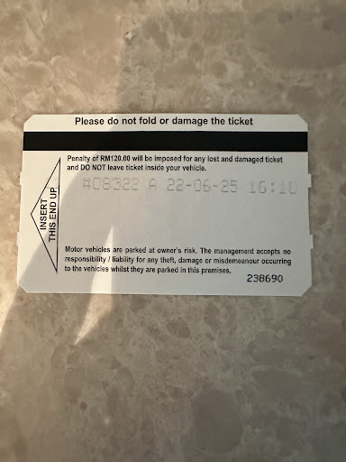 The hotel utilises a third party company for carpark services, and they issue tickets when u enter the gantry. My father had misplaced the ticket in the hotel, and when we enquired with front desk about it, they said to go to the parking attendant’s room to get it rectified. Fast forward to trying to get a replacement ticket and was hit by a 200RM replacement fee for a parking ticket. The hotel and carpark are not transparent about this fee, as it does not state such a fee at the gantry, nor do the staff tell you upfront about the importance of this piece of paper.