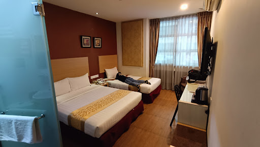 Read moreExceeded expectation for a budget hotel.|1. Ample parking is available in front of the hotel with security guard watching. Police station is in the same row.|2. Front desk staff friendly and helpful. We checked in really late and called to reserve and Mr Philip helped with the extra room access card request. Fast check in & check out.|3. Good security as access card is needed to access room floors in the lift.|4. We booked a room for 3 pax. Room window facing inside the complex (empty space which houses some drinking joints). Sound proofing good hence quiet room. Bathroom extractor fan is quite loud so you'll need to turn off to ensure proper quiet environment. |5. Basic amenities available in room: flat screen TV, kettle for hot water and 3-in-1 coffee, mini fridge and safe, hot water, toothbrush, shower cap. Only gripe is the water pressure in the shower is weak. :(|6. Table lamp in room not functioning. |7. Comfortable bed with...