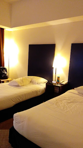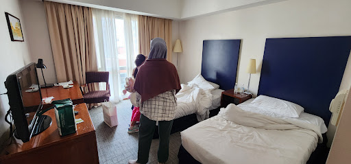 Space is not a problem for these rooms. Some things are a bit dated when you use them but the room looks great and you can't even really tell until you open a drawer and it's a little stuck. Not really an issue though. Bed was fine, I really liked the pillows. Outlets were sparse but are workable. TV has 3 different movie channels which have some decent movies if you're looking for that but not too many overall channels or language varieties. The view from the window was okay. There was a fine mini fridge in the room. The bathroom was pretty good. Decent counter space. Nice roomy shower with some great hot water. The toilet flushing was unique but fine. The towels were a bit thin for my taste but did the job. They also gave a bar of soap instead of liquid which isn't my favorite either but it was fine.