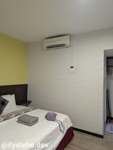 Comfortable basics - King bed with 4 pillows and comforter. Air-conditioned room came with hot showers, kettle with sachets of coffee-tea-sugar and 2 set of mugs with tea spoons, fridge, 2 bottled water, a box of tissues, dressing table, LED (which I'm guessing people don't use much) and hanging wardrobe with hangers and top shelf.