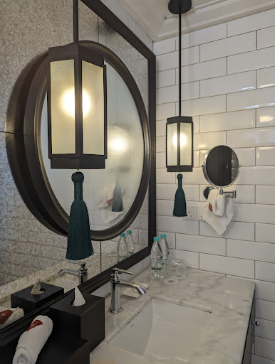 The bathroom was great! No bathtub but a great shower with a rain shower option. Lots of hot water and l'occitane soap and stuff. Thick fluffy towels and thin (silk like?) dressing gowns. White long one with a red sash for me, and a red-gold short one with a gold sash for my wife. Good for lounging on the bed.
